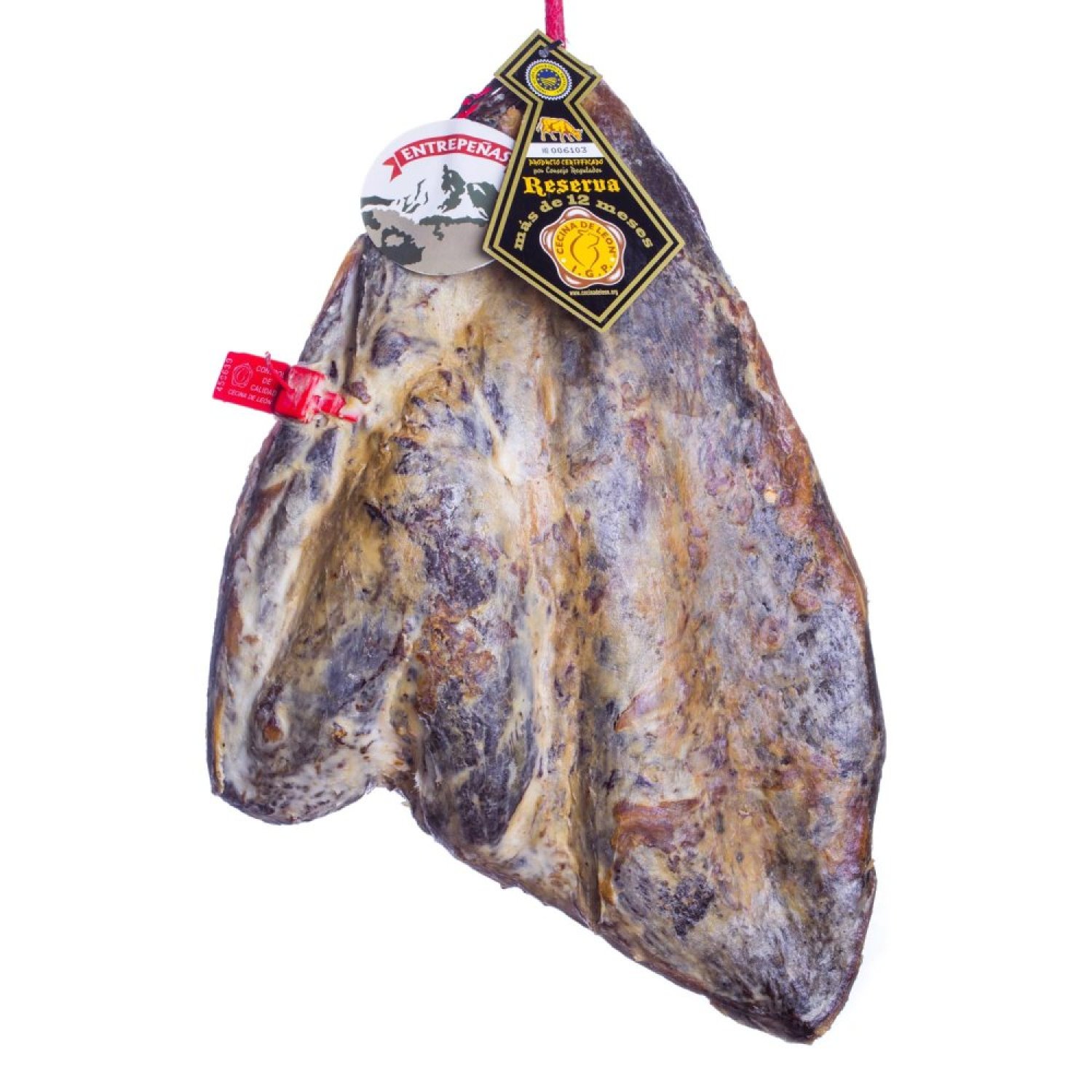 A nuestra cecina de León Reserva Entrepeñas, acogida desde hace años a la I.G.P., se la diferencia con una vitola definitiva alusiva al nombre Reserva y a la máxima: "Más curación más calidad".