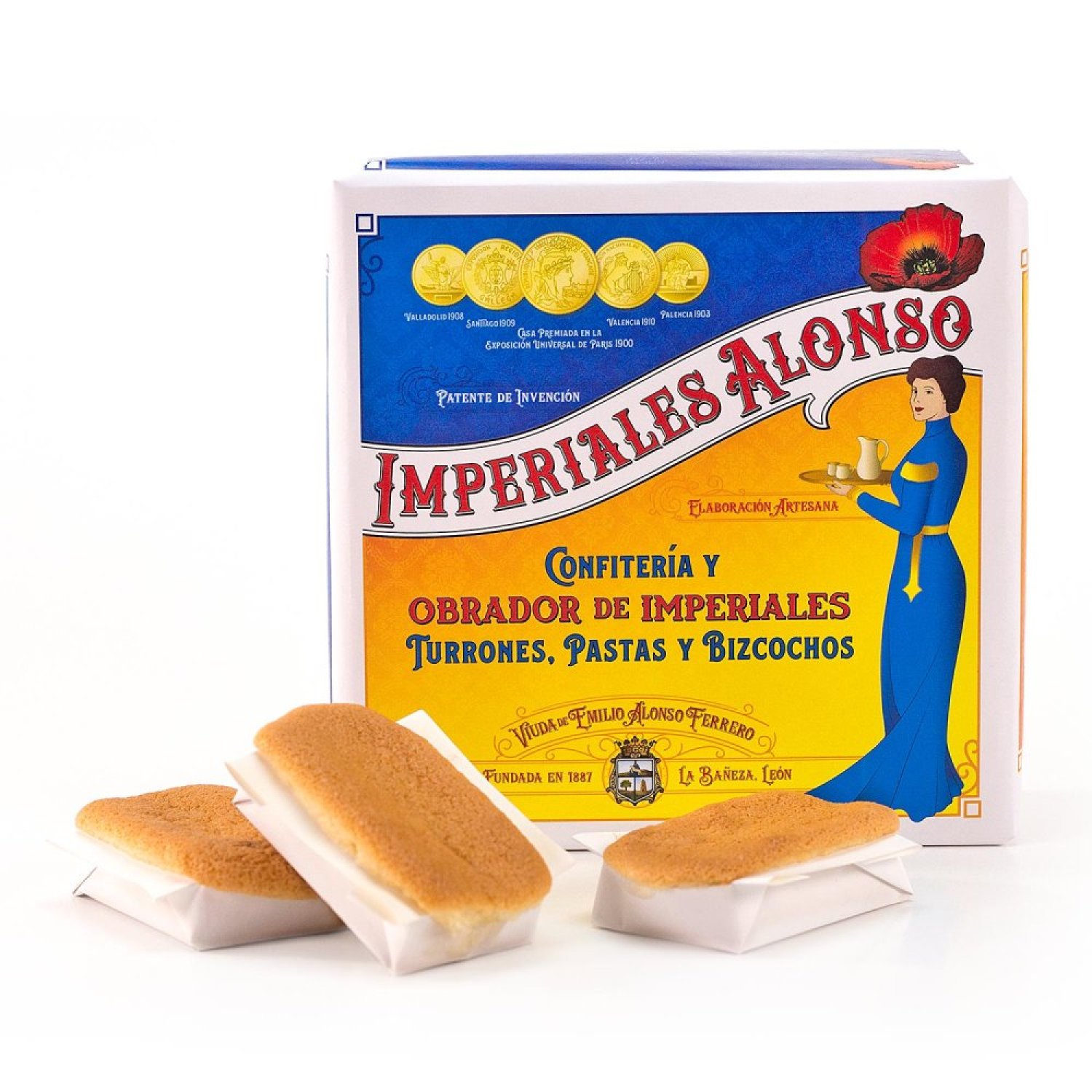 Desde finales del S.XIX, la familia Alonso elabora estos pequeños bizcochos hechos de almendra, huevo y azúcar, y presentados en una caja cuyo envoltorio es el mismo con el que el bisabuelo del actual gerente, Ordoño, ganó la Medalla de Oro de la Exposición Universal de París en el año 1.900.